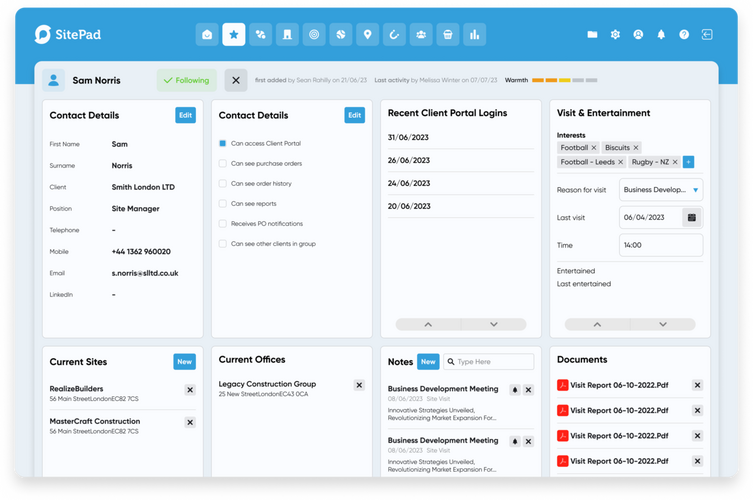 SitePad, construction sales software, offers a unique, fast and simple way of viewing the entire client account in a single view. Clearly see the client's credit limit, potential, active and prospective sites, along with offices and contacts.