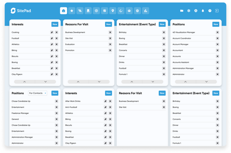 SitePad construction sales CRM allows you to add small or large event types with multiple client contacts and internal sales reps along with event details, types and expense receipts. Reporting on your event costs, clients and locations.