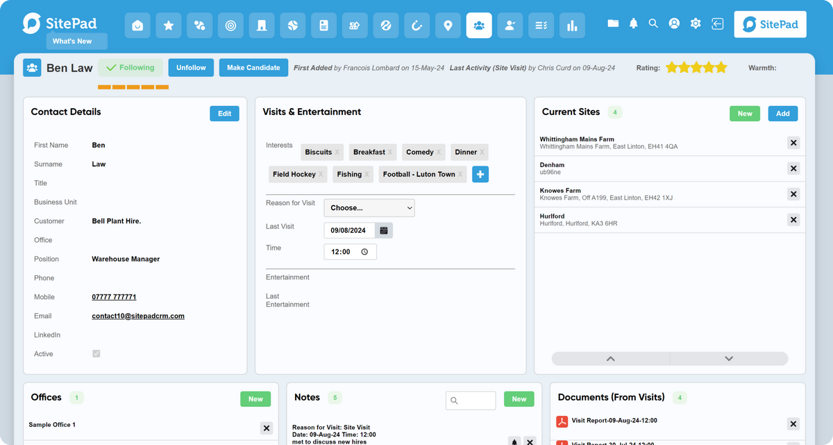 SitePad meets construction industry requirements out of the box allowing you to maintain large complex construction groups to small subcontractors. Easily create, manage and report on clients, multiple sites, offices and contacts. Capture contact interests, visits, meetings and calls quickly and easily on the move.